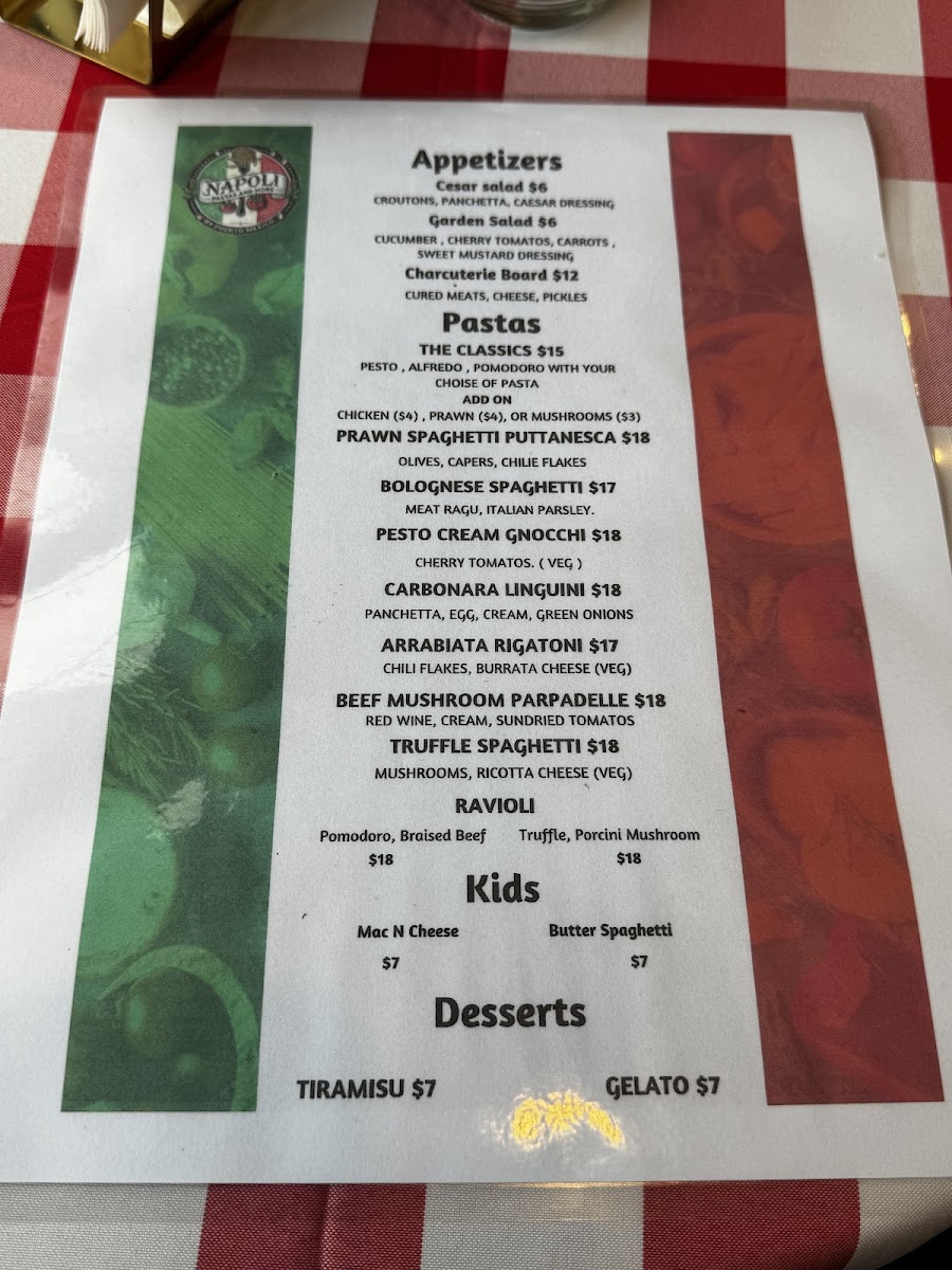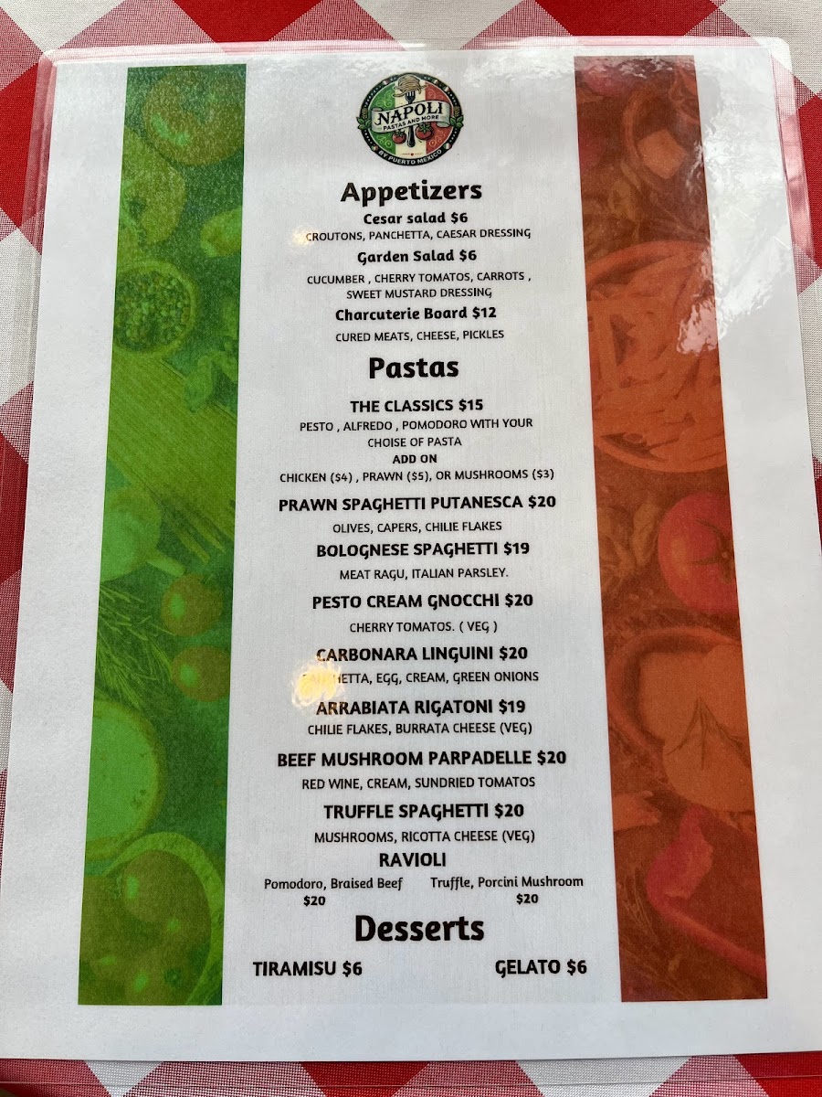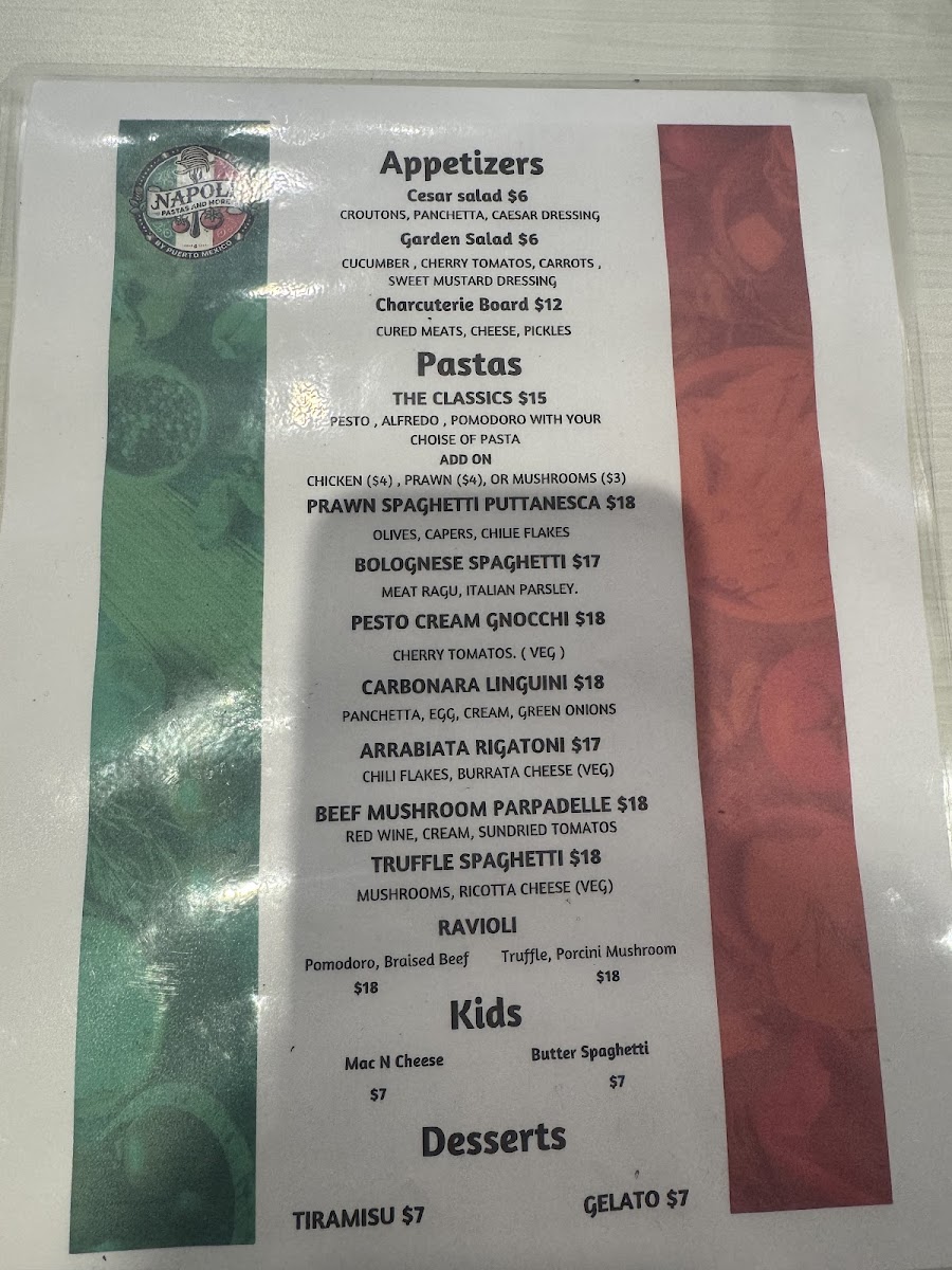 Napoli Pastas and More offers a straightforward, inviting Italian menu that feels both familiar and thoughtfully crafted. The selection centers on comforting pastas made with fresh ingredients, complemented by a handful of simple appetizers and classic desserts. This is the kind of place where you can settle in for a relaxed lunch or a casual dinner, enjoying dishes that reflect traditional Italian flavors with a touch of homey care.